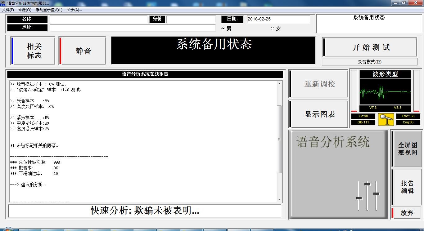 TH4.0版语音分析系统是一款为执法机构、保密、军队等部门设计,功能强大的辅助调查工具。使用者可以通过它感知、分析对方情绪的变动,辨别对方谎言和识别对方的欺诈意图,揭示其行为动机。用于个人行为分析中,发现异常,排查线索,可节省办案时间,提高办案效率。
