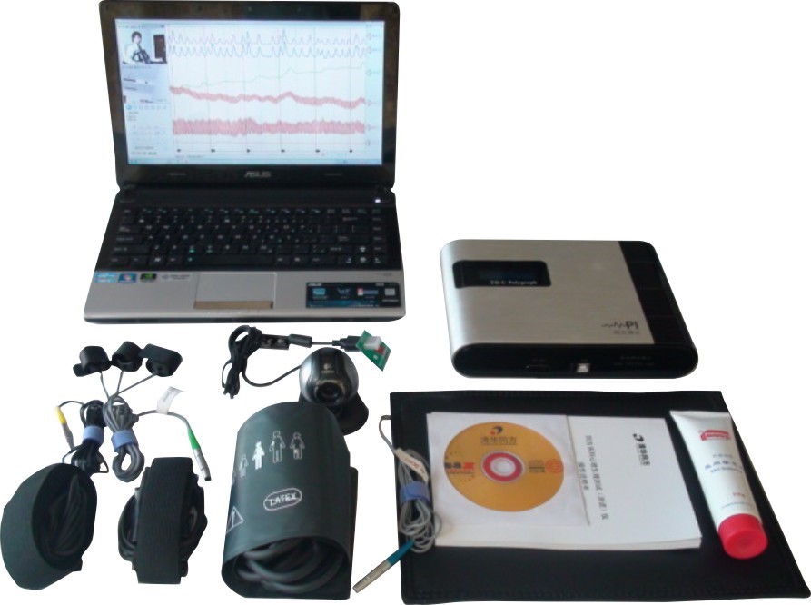 系统组成:传感器(胸呼吸、腹呼吸、皮肤电阻、血压、指脉/血氧饱和度、反测谎动作)、主机、实时监控系统、系统专用软件四部分;所有传感器接口与主机正上方实现:分颜色、分卡口识别对接,采用USB接口并同时供电。